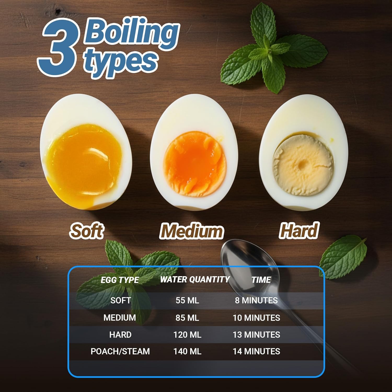 CUSTOM BOILING OPTIONS : Offers 3 boiling levels – Soft, Medium & Hard – to suit every taste and recipe for hassle-free, consistent results.