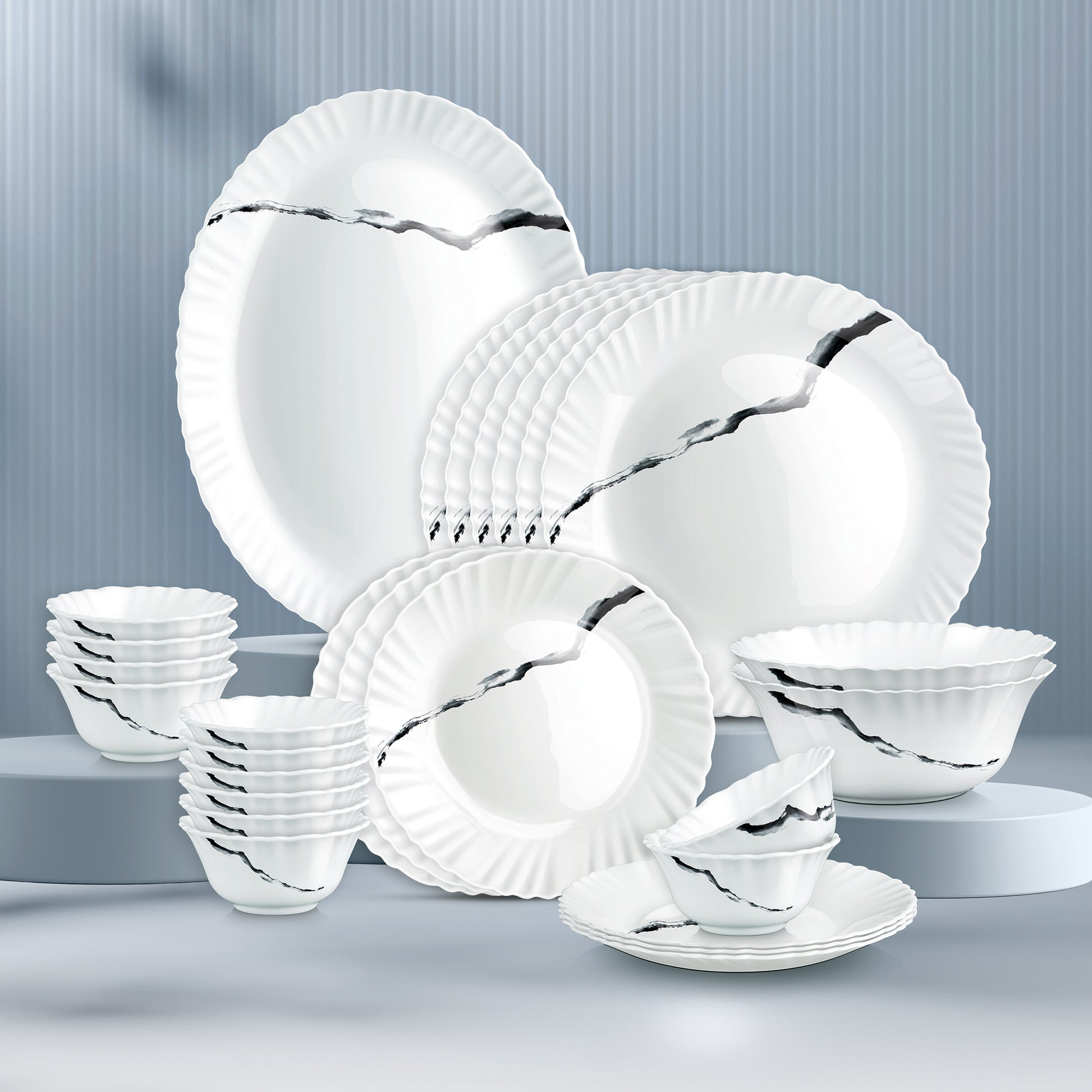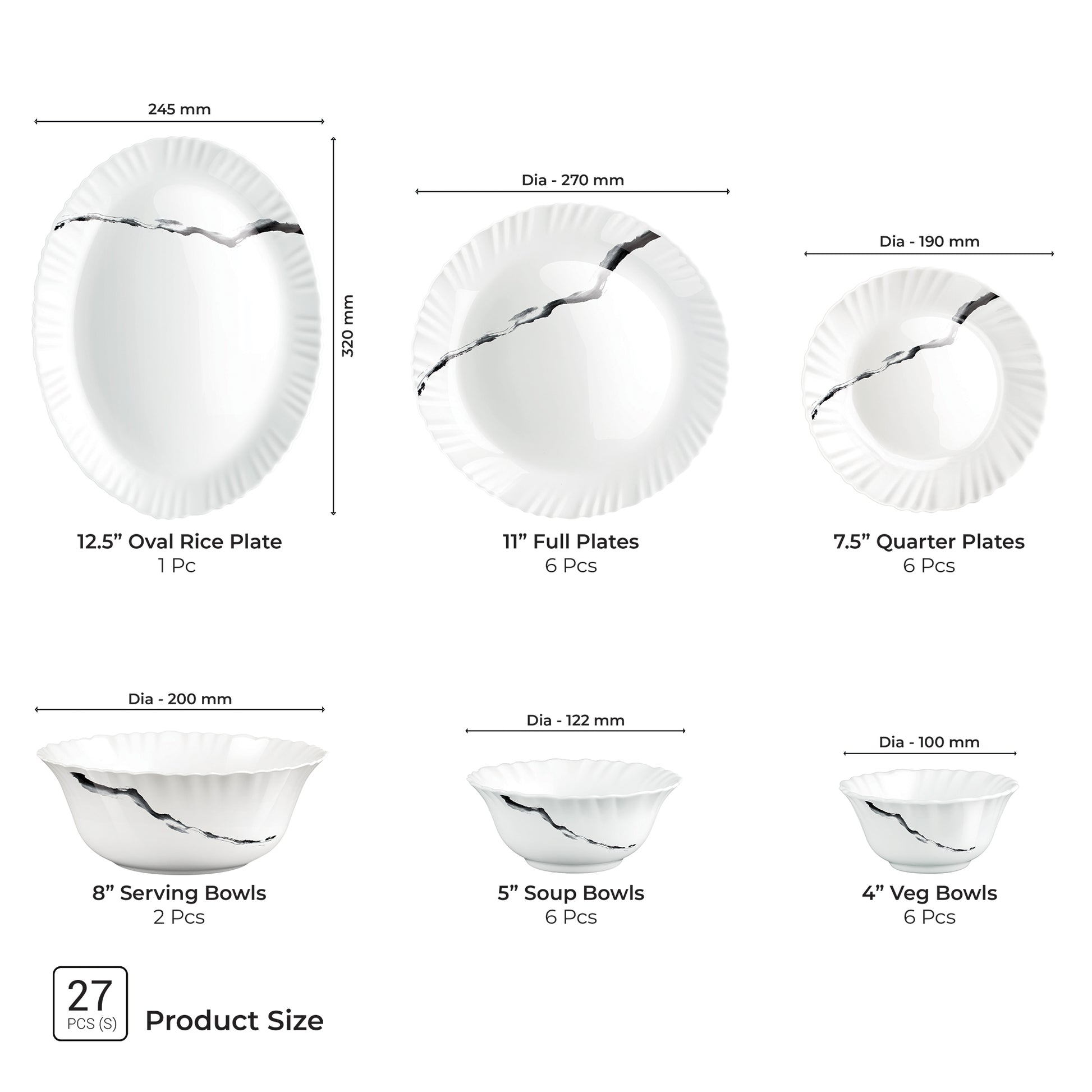 27 Pcs Set (S) - 6 x 11" Full Plate, 1 x 12.5" Oval Plate, 6 x 7.5" Quarter Plate, 2 x 8" Serving Bowl, 6 x 4" Veg Bowl, 6 x Soup Bowl