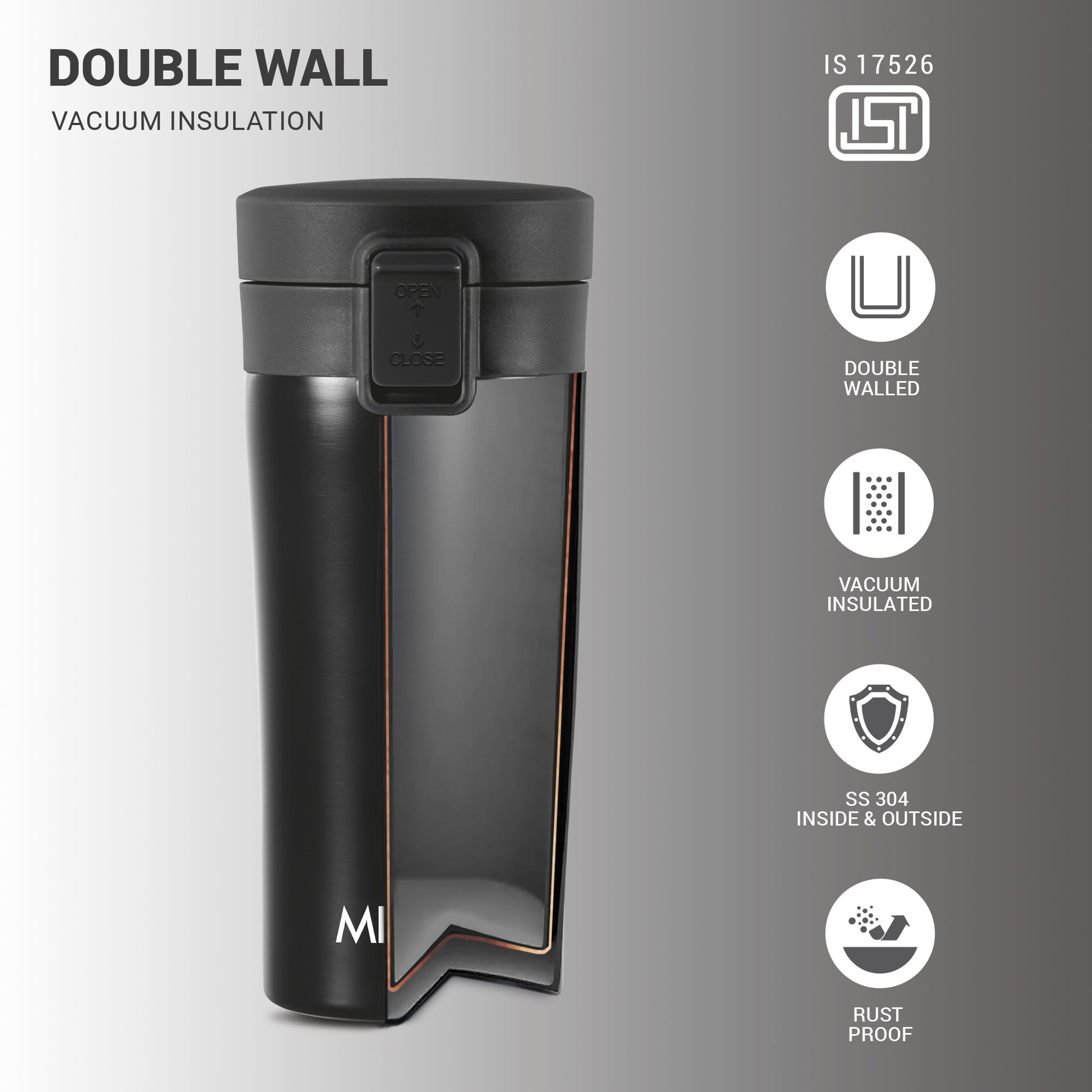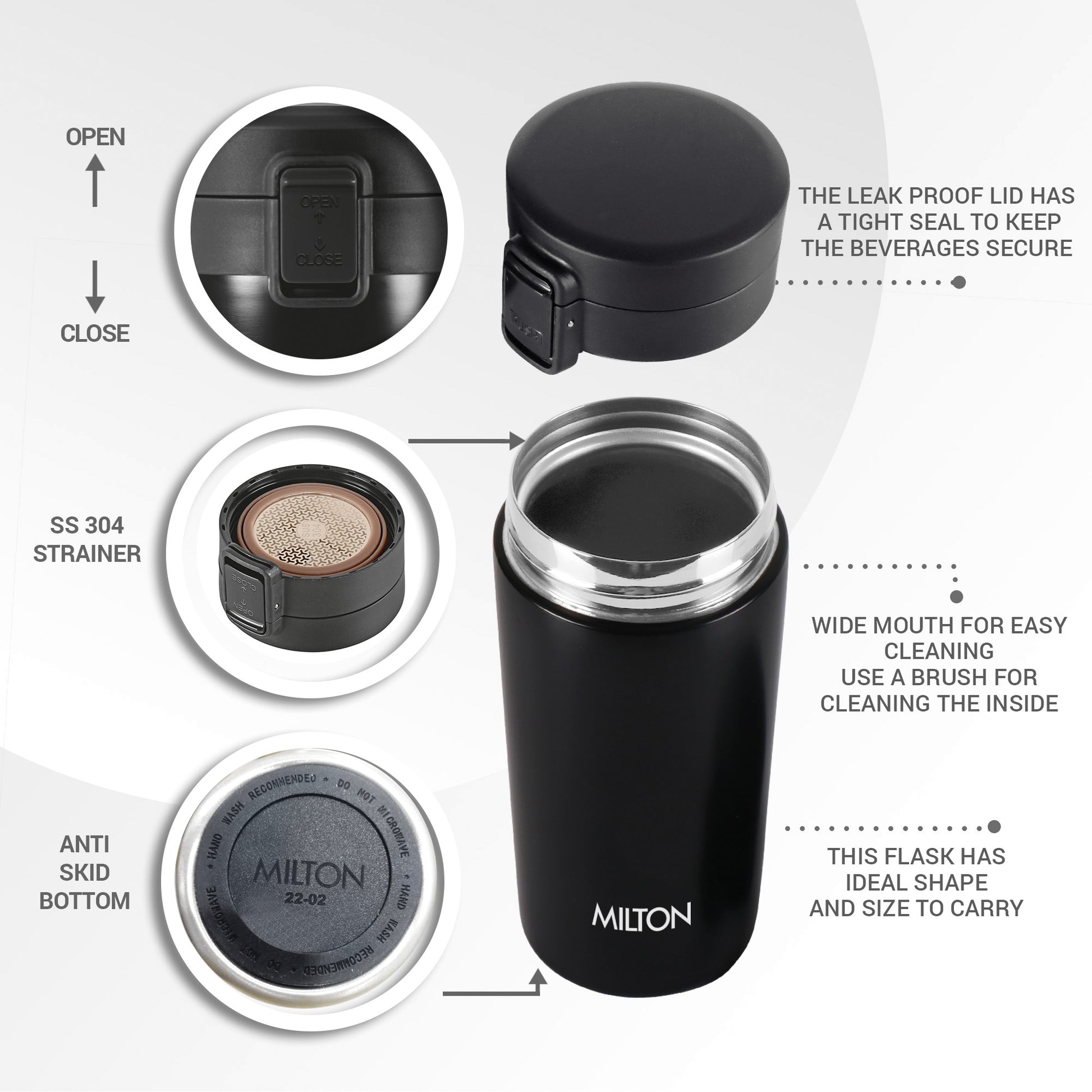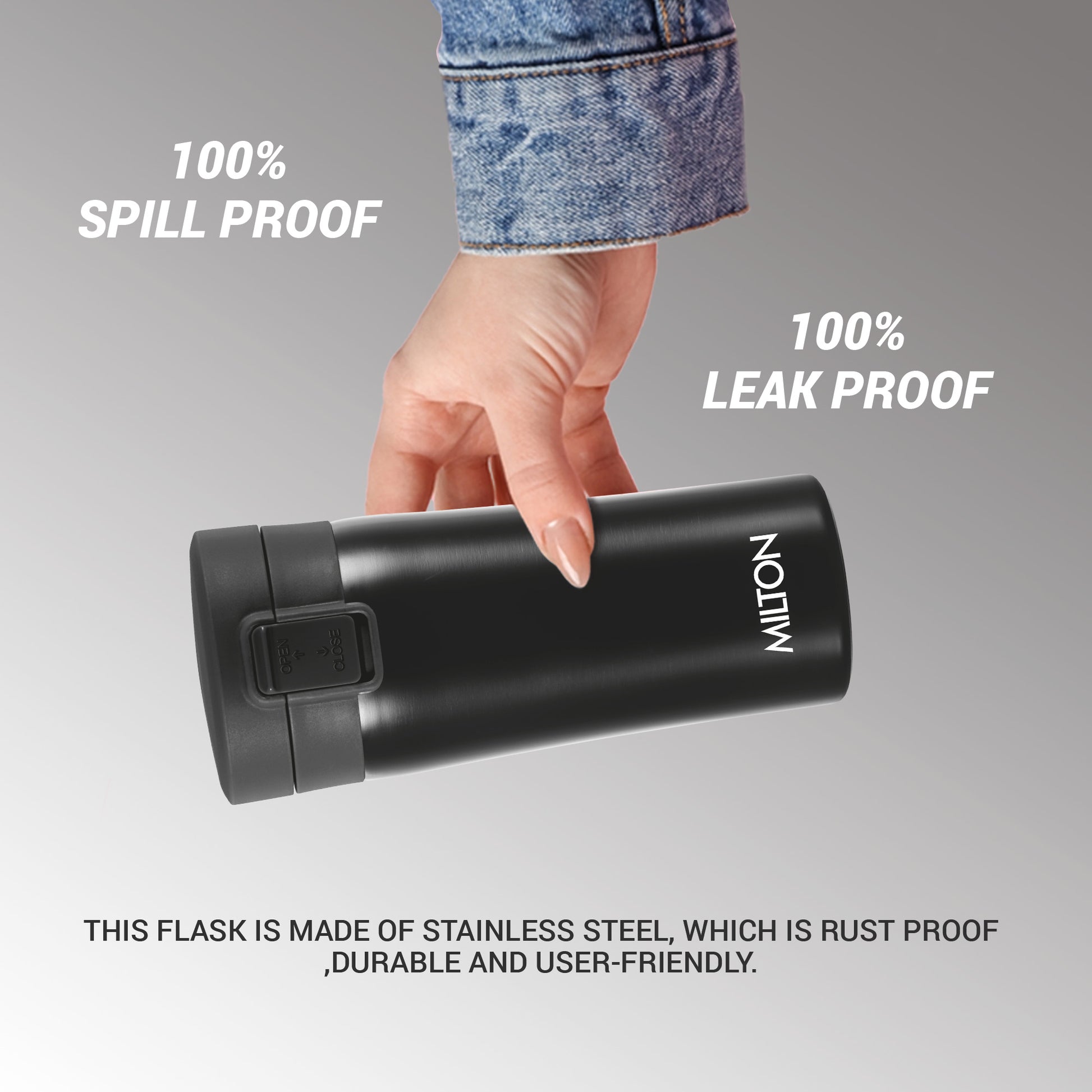 Milton Thermosteel Insulated Coffee Mug is a leak-proof and durable flask made of stainless steel. The mug retains the temperature of beverages, making it ideal for carrying coffee, soup, tea, and more. It comes with a 1-year warranty and is built to withstand the demands of everyday use. The insulated technology keeps beverages hot or cold for hours, making it perfect for any trip or on-the-go use. The flask is rust-proof, user-friendly, and highly functional, making it an appropriate choice for storing beverages.