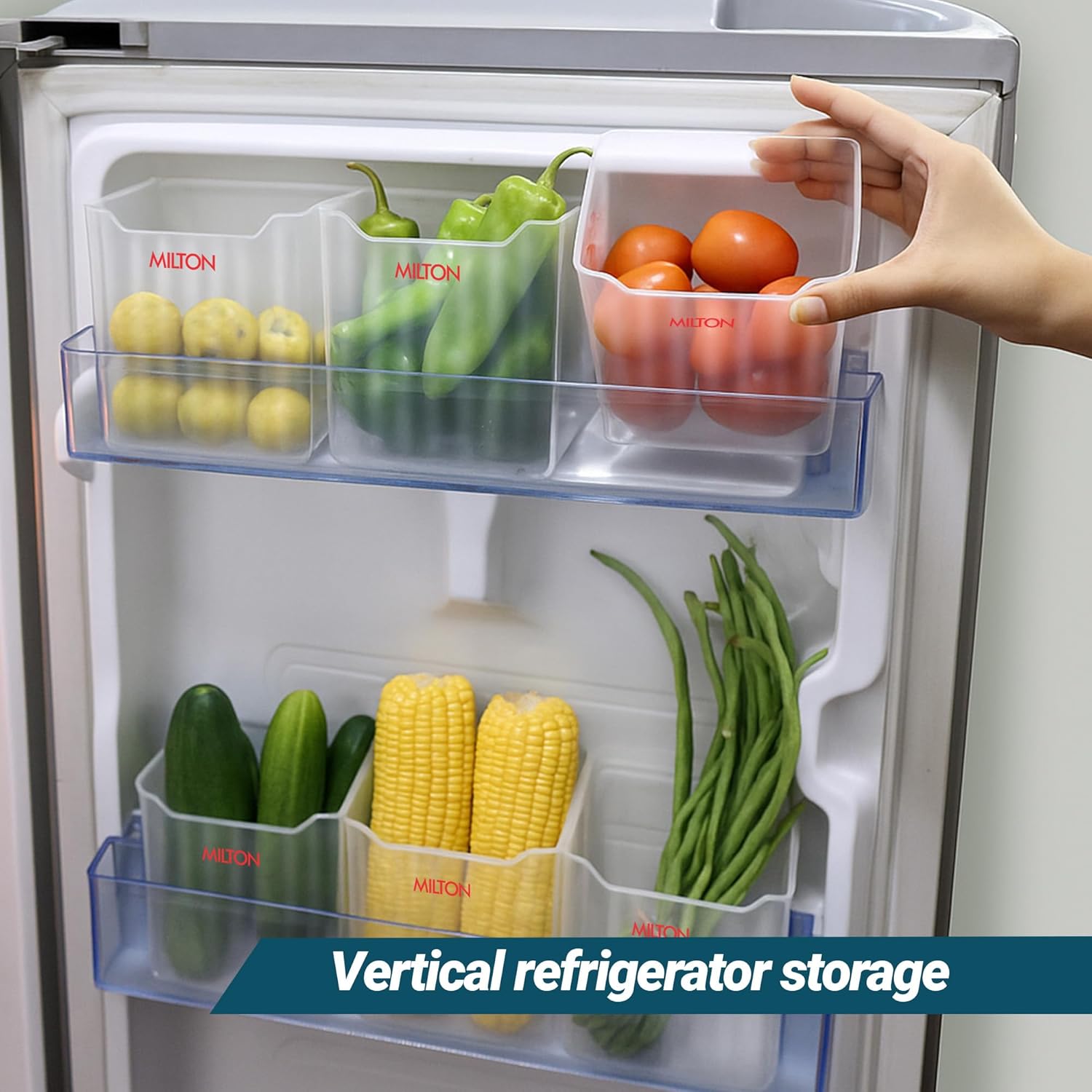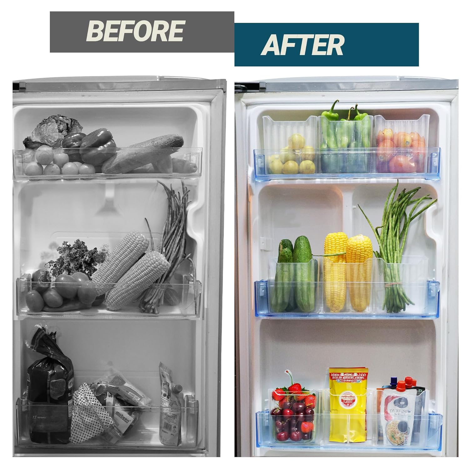 Kitchen Essentials To Maximize Fridge Door Space : Utilize unused fridge door space by neatly storing fruits, veggies, sauce pouches, and condiments in stackable containers—no more clutter.