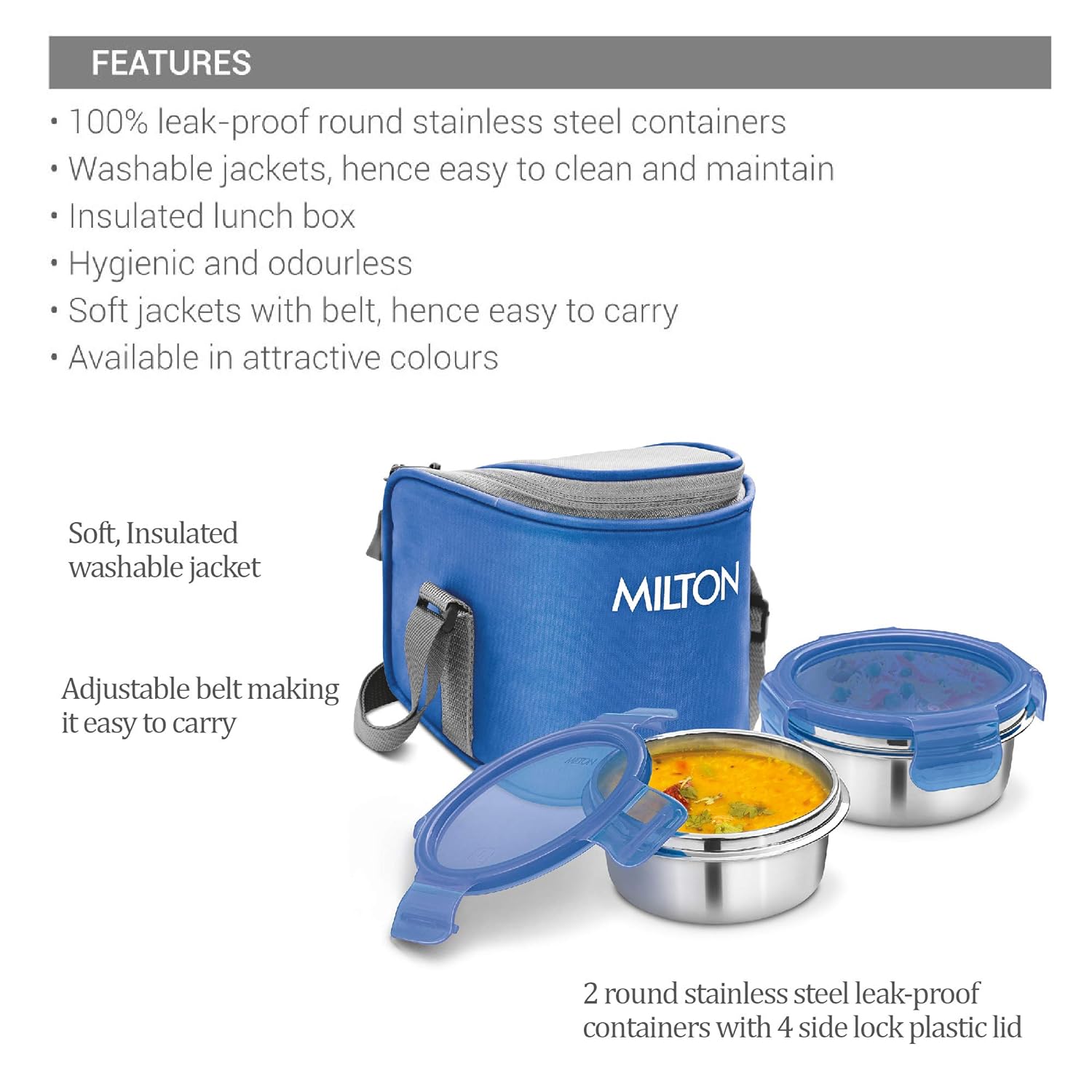 - It contains 2 round stainless steel leak-proof containers with 4 side lock plastic lids, ideal for office, workplace, schools, and colleges.