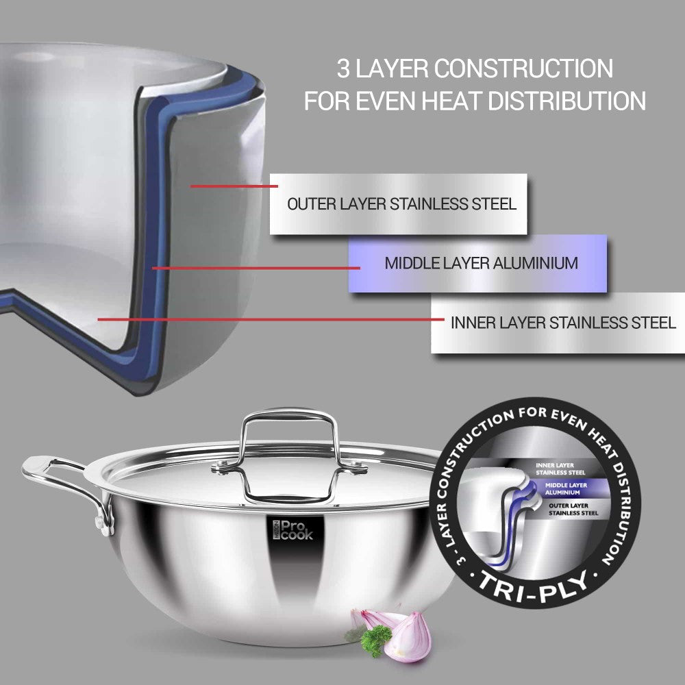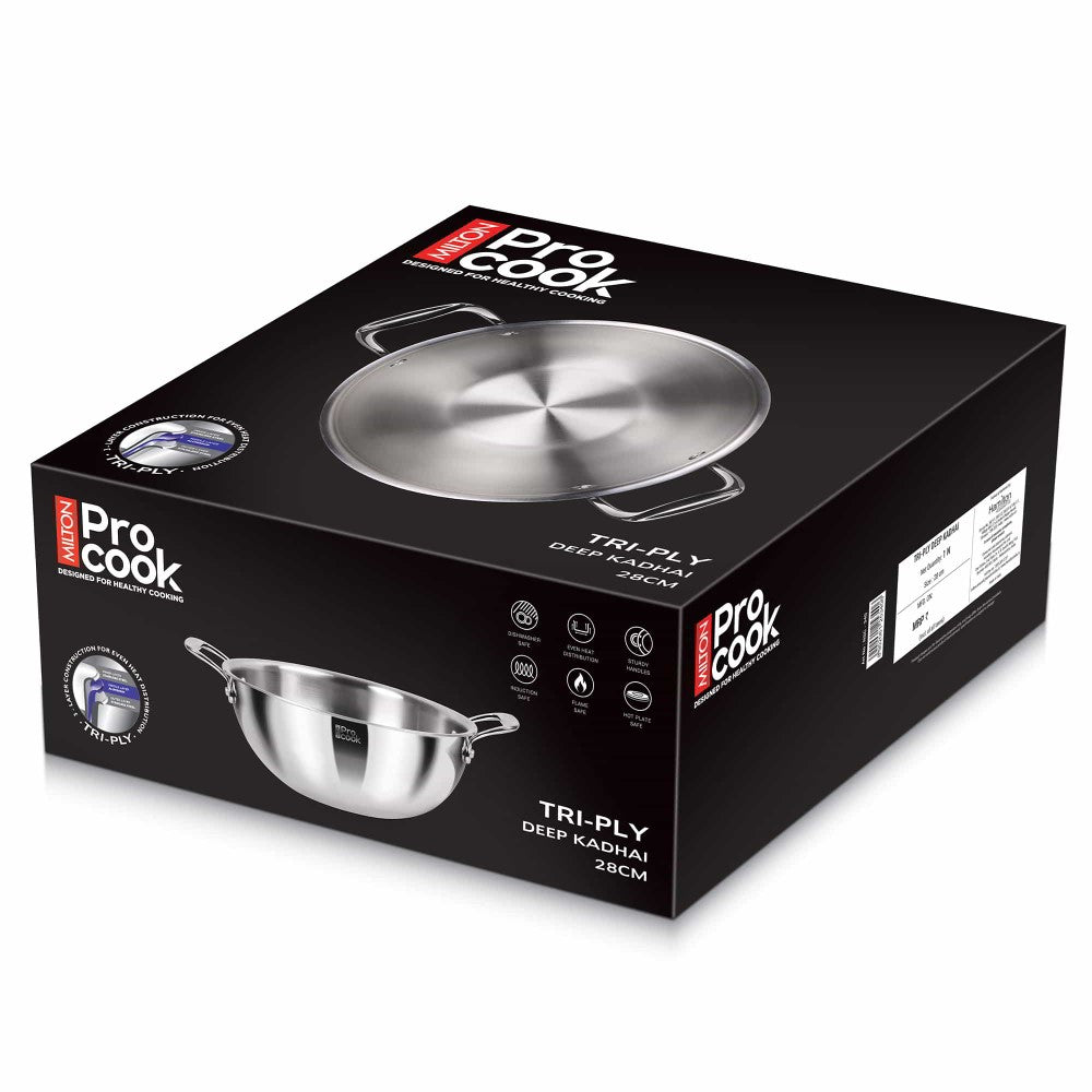- The Milton Pro Cook Triply Deep Kadhai is a non-stick cookware with three layers of metal for even heat distribution.