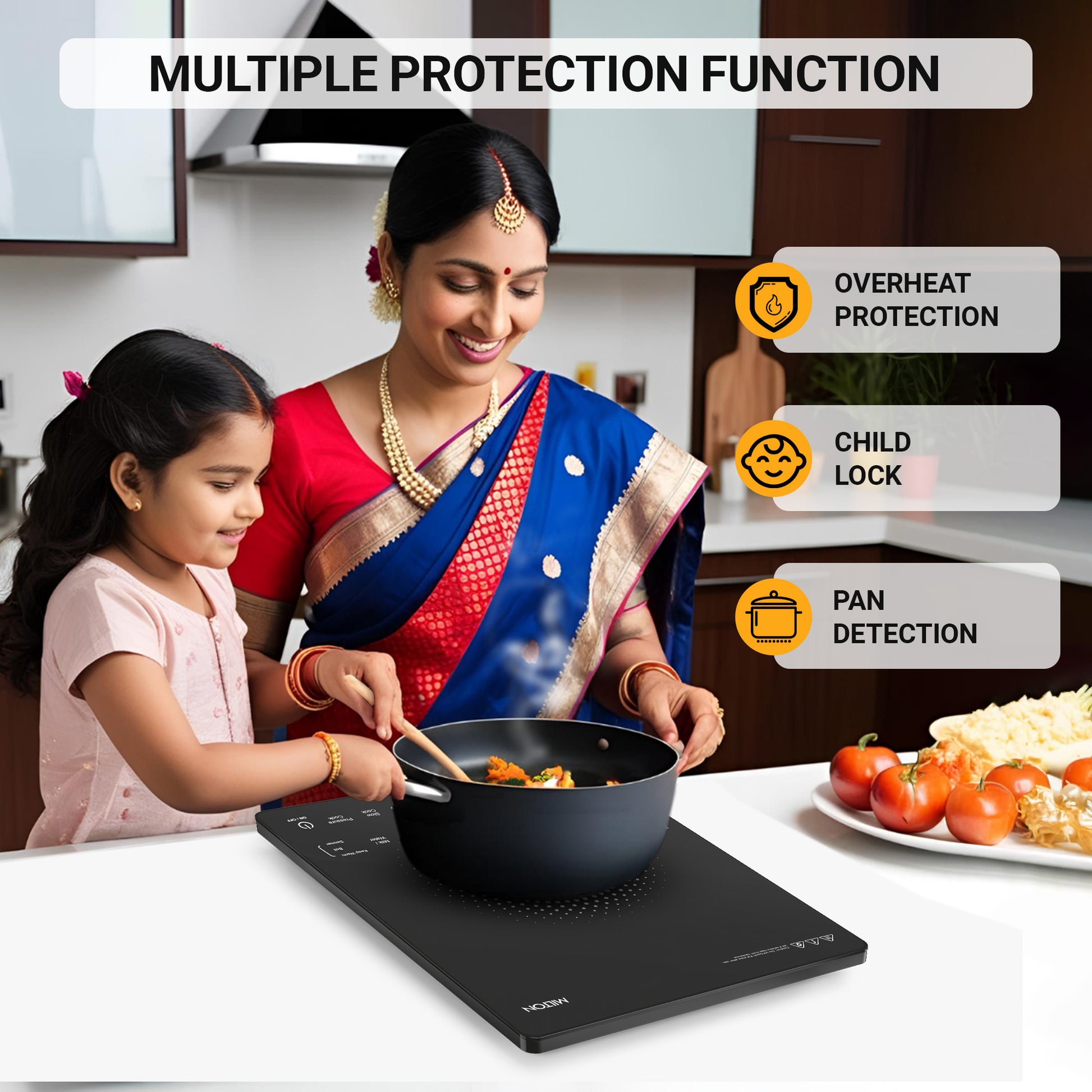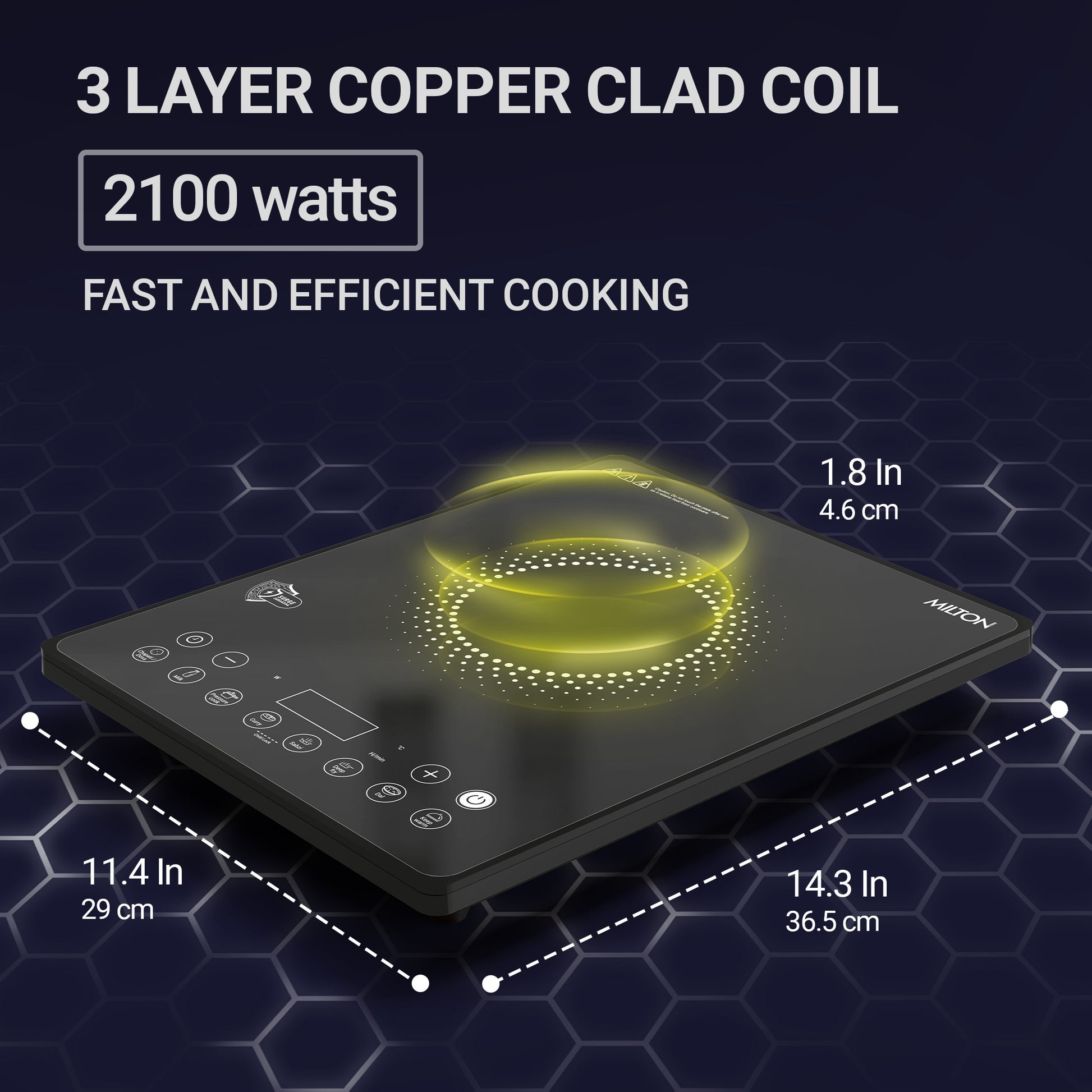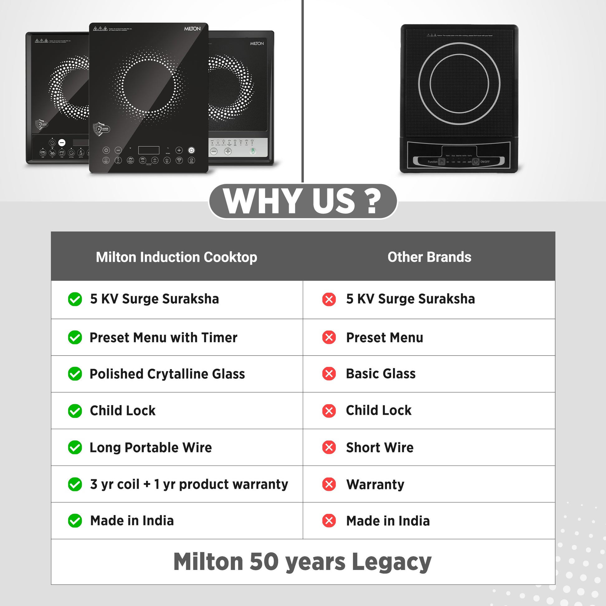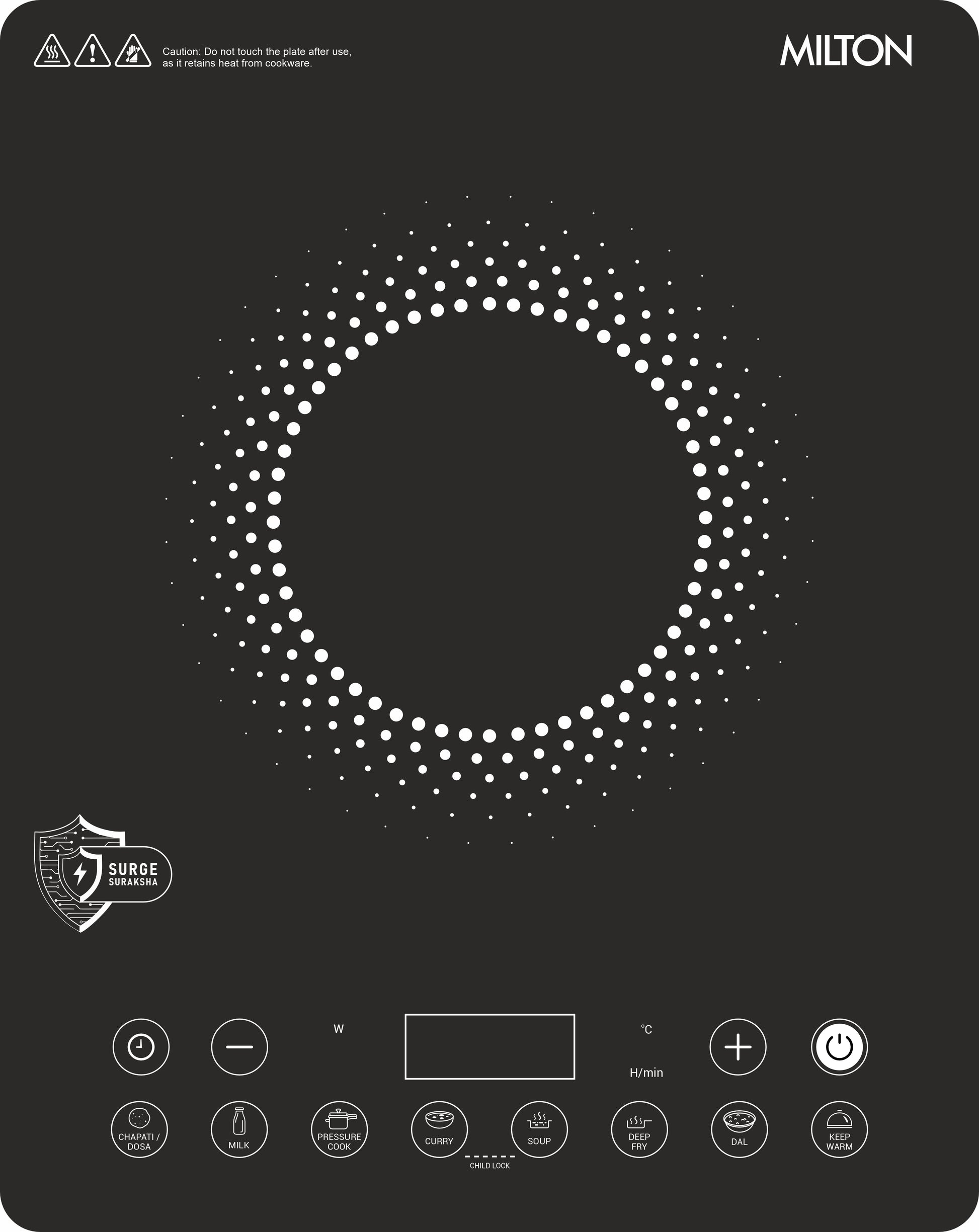 Milton Induction Cooktop, designed are high quality, efficient, stylish devices made for maximum convenience. Featuring advanced Surge Surakasha, with Triple MOV & Triple TVS technology and pre programmed auto cook functions, provides superior quality with zero hassle.