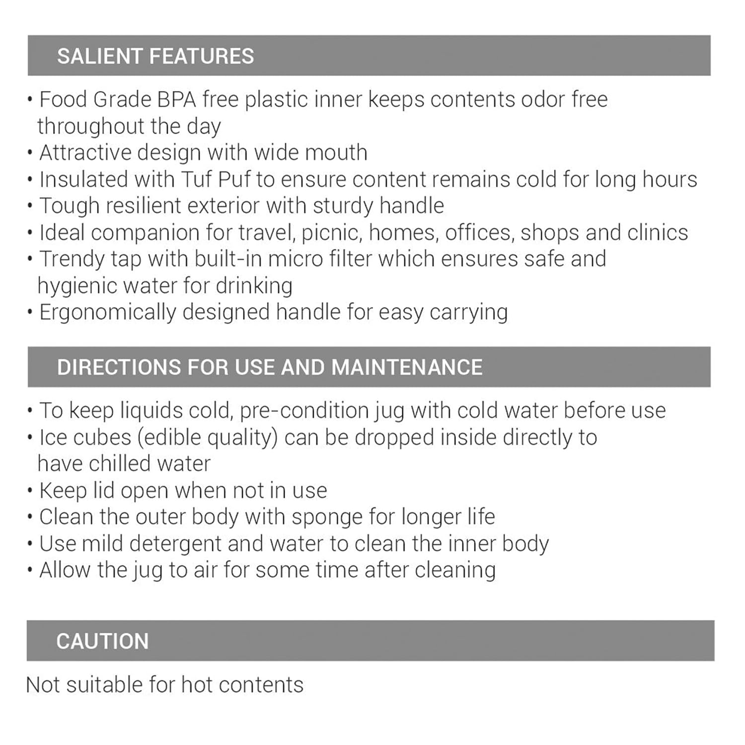 Cool Comfort, Everyday : Elegant shape that increases your style quotient. This Water jug are made from Food Grade BPA free plastic inner keeps contents odor free throughout the day. Insulated with Tuf Puf to ensure content remains cold for long hours.