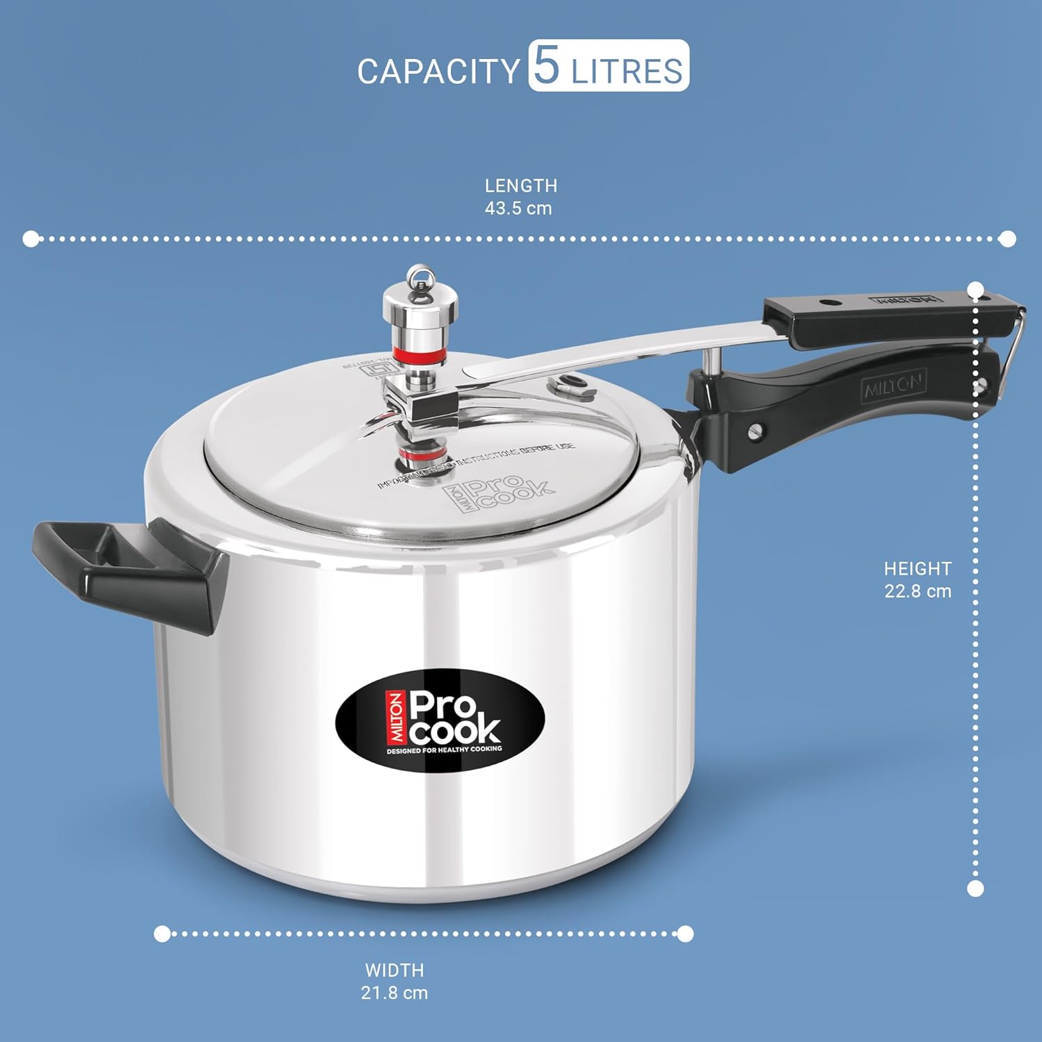 Premium Construction : Made from virgin Hindalco aluminum and features a thick 4mm induction base for even heat distribution. The inner part of the cooker has a matt finish, while the outer body boasts a super glossy finish. The lid is equipped with a hard anodized safety valve, ensuring enhanced safety. Additionally, the cooker is designed with an SS 304-grade handle bracket and is fixed with a non-heating cast aluminum locking hook for added durability and comfort during use.