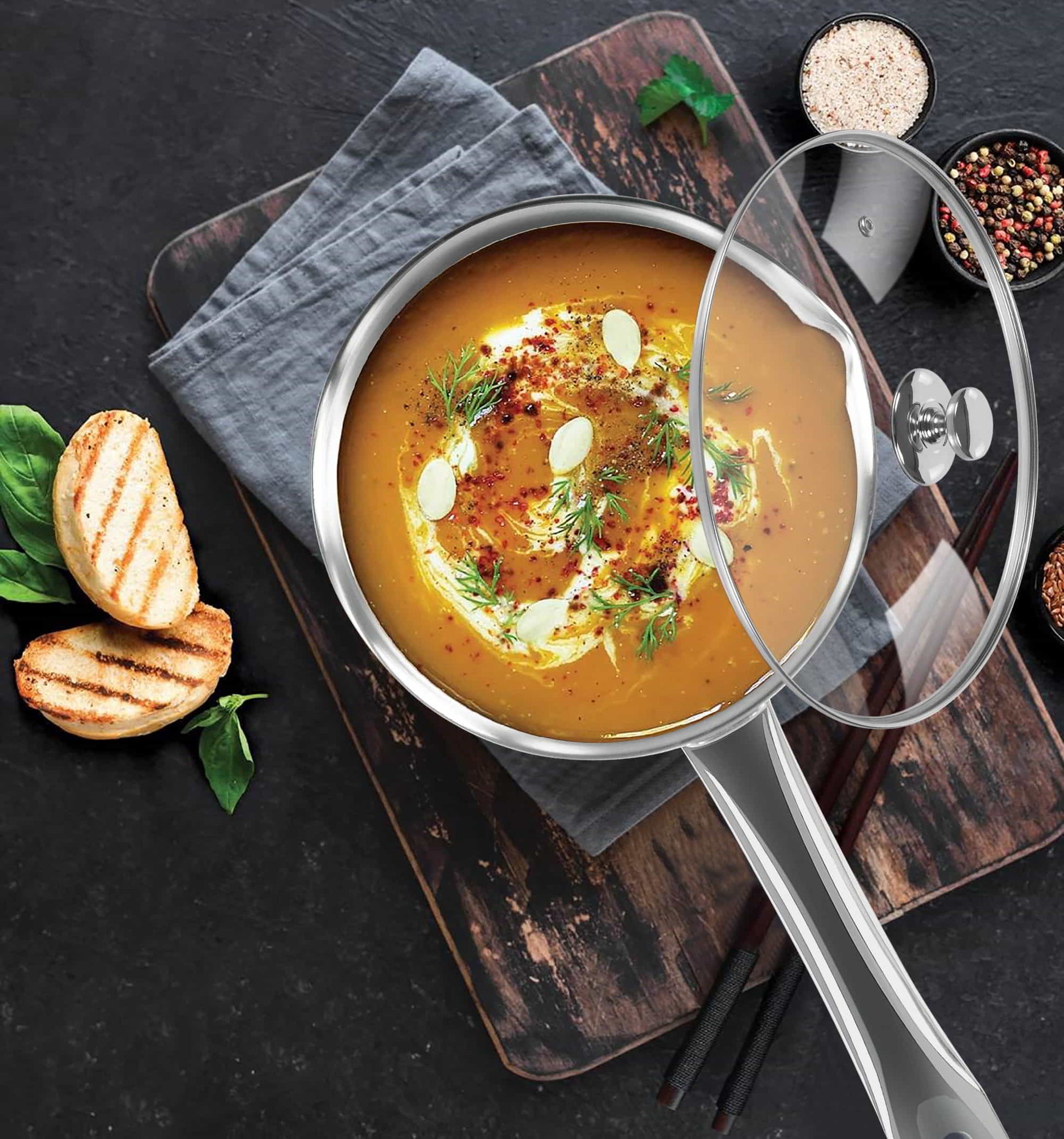 - 2nd layer - encapsulated layer of aluminium in the middle right throughout the cookware including the bottom and the body, for an even distribution of heat which enables faster cooking