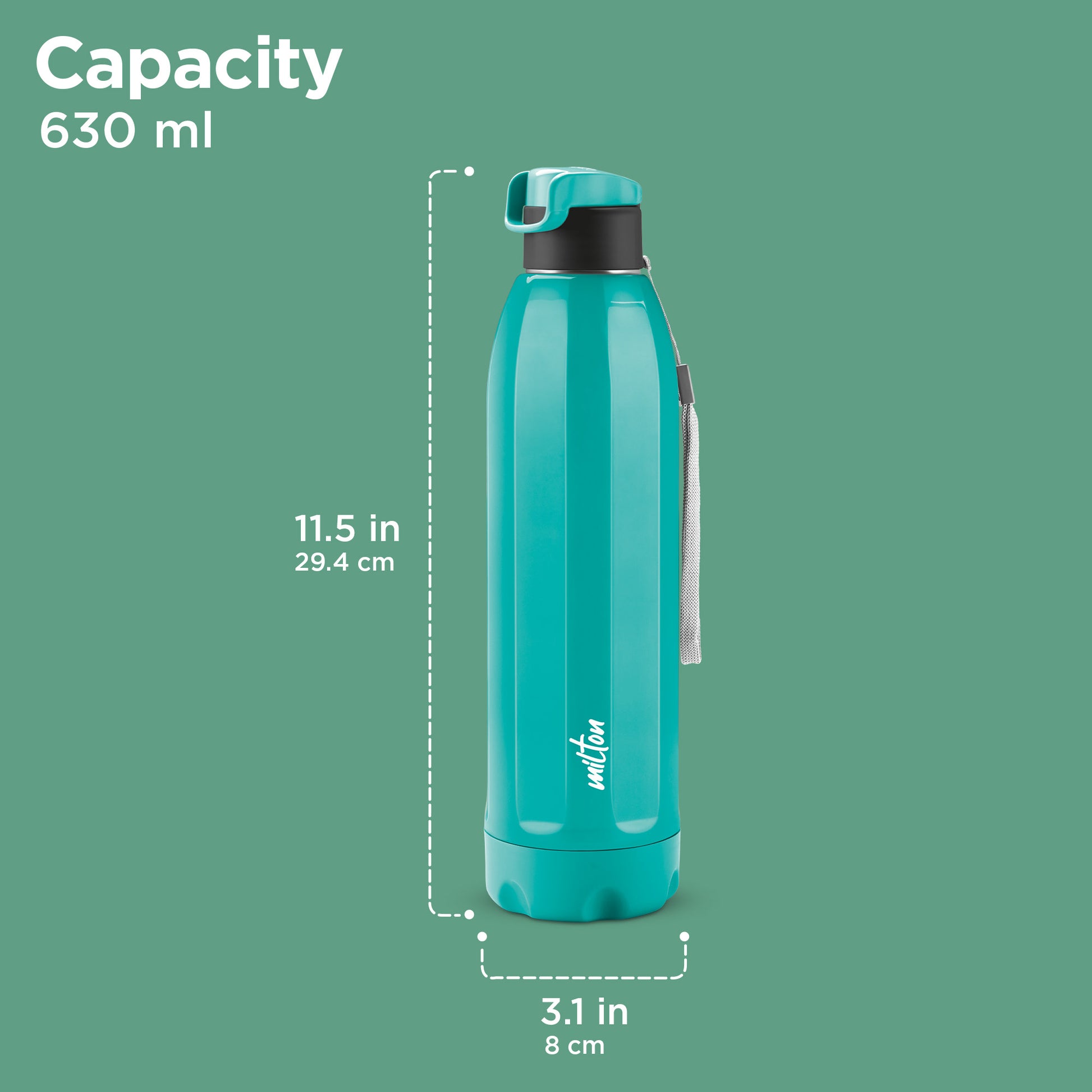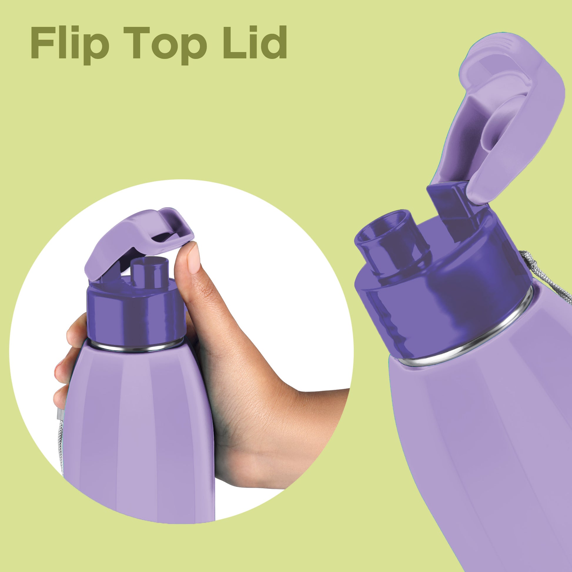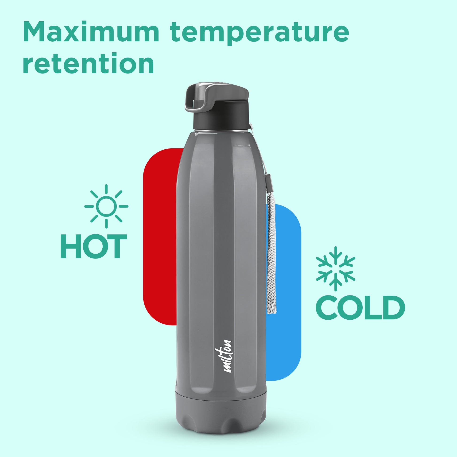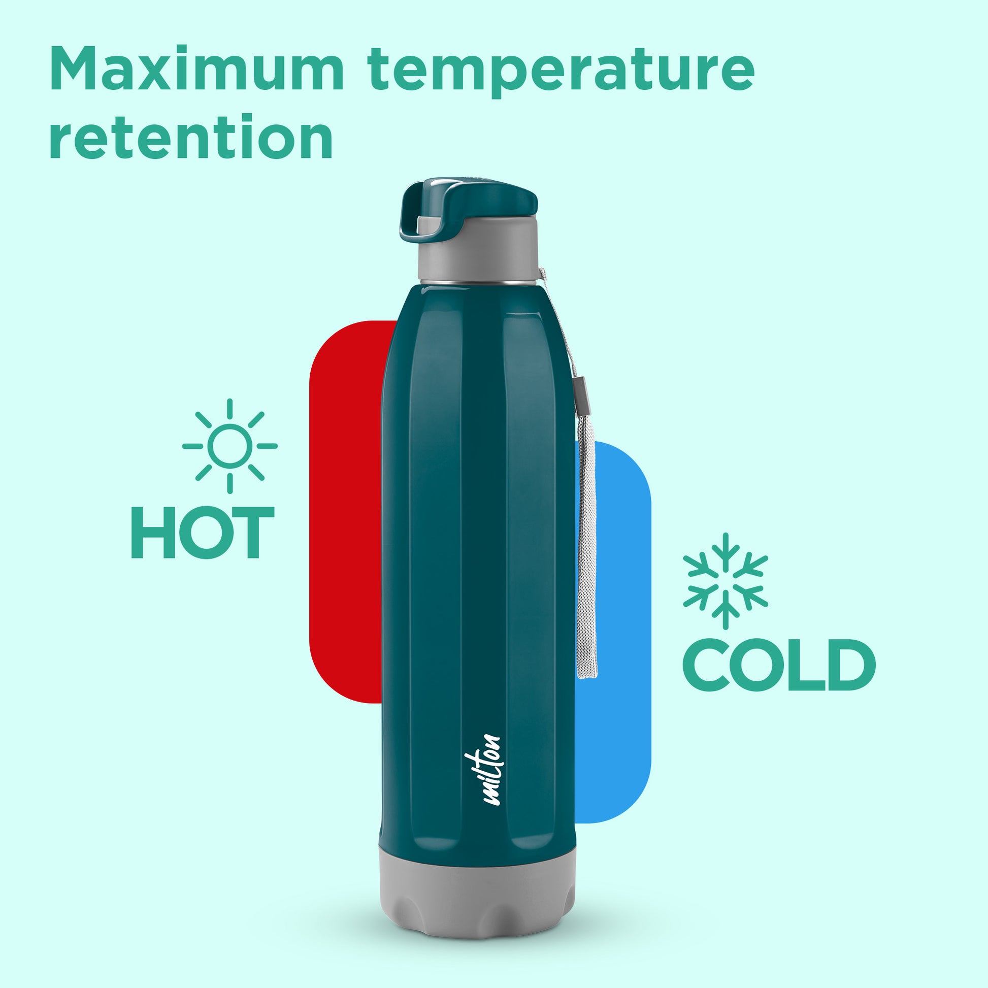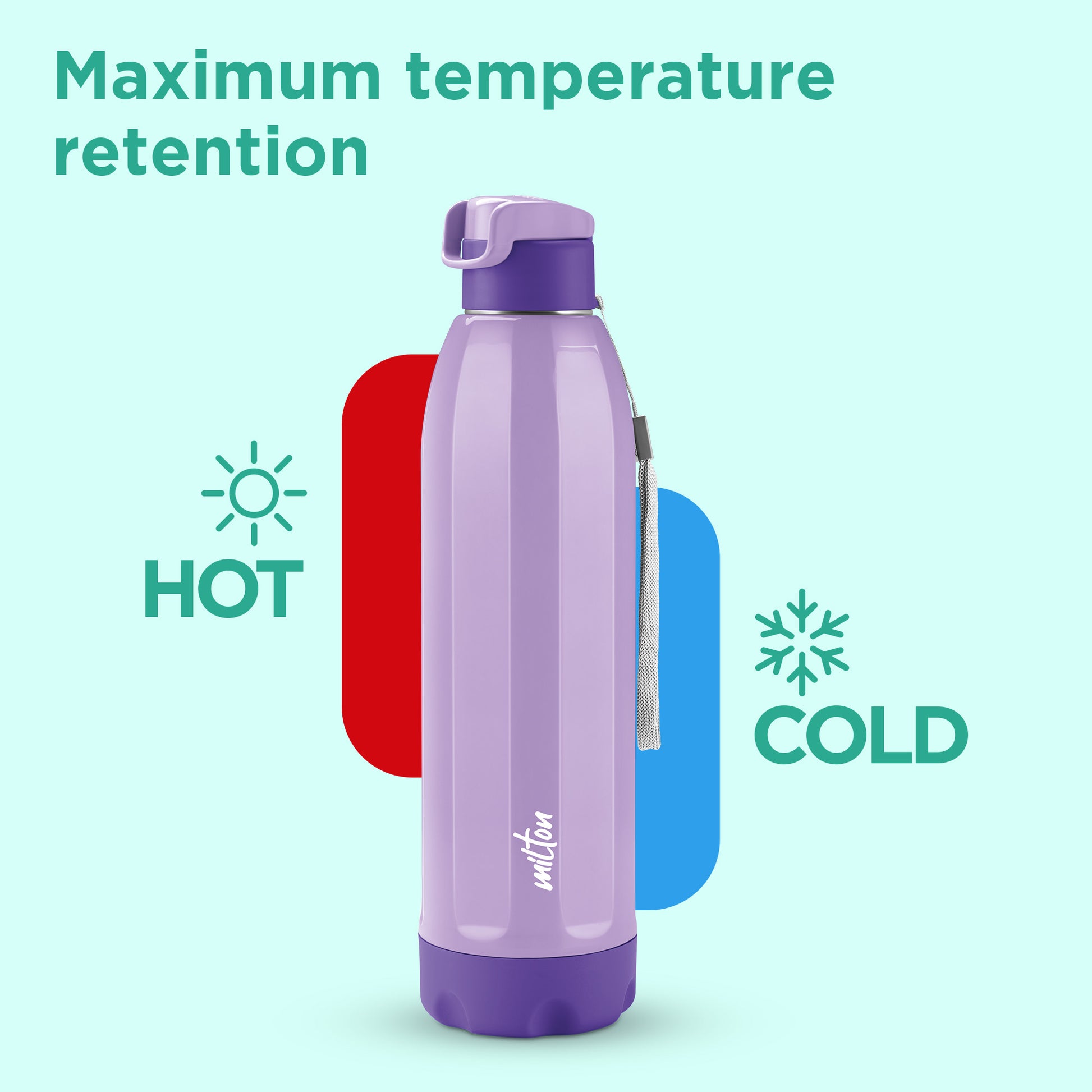 The bottle is leak-proof and suitable for various activities. It is recommended for carrying clean water while traveling and comes with a 1-year warranty. The insulated stainless steel interior regulates the temperature and keeps drinks hot or cold for hours. The bottle can store hot water up to 40°C temperature. This bottle comes with an extra lid.