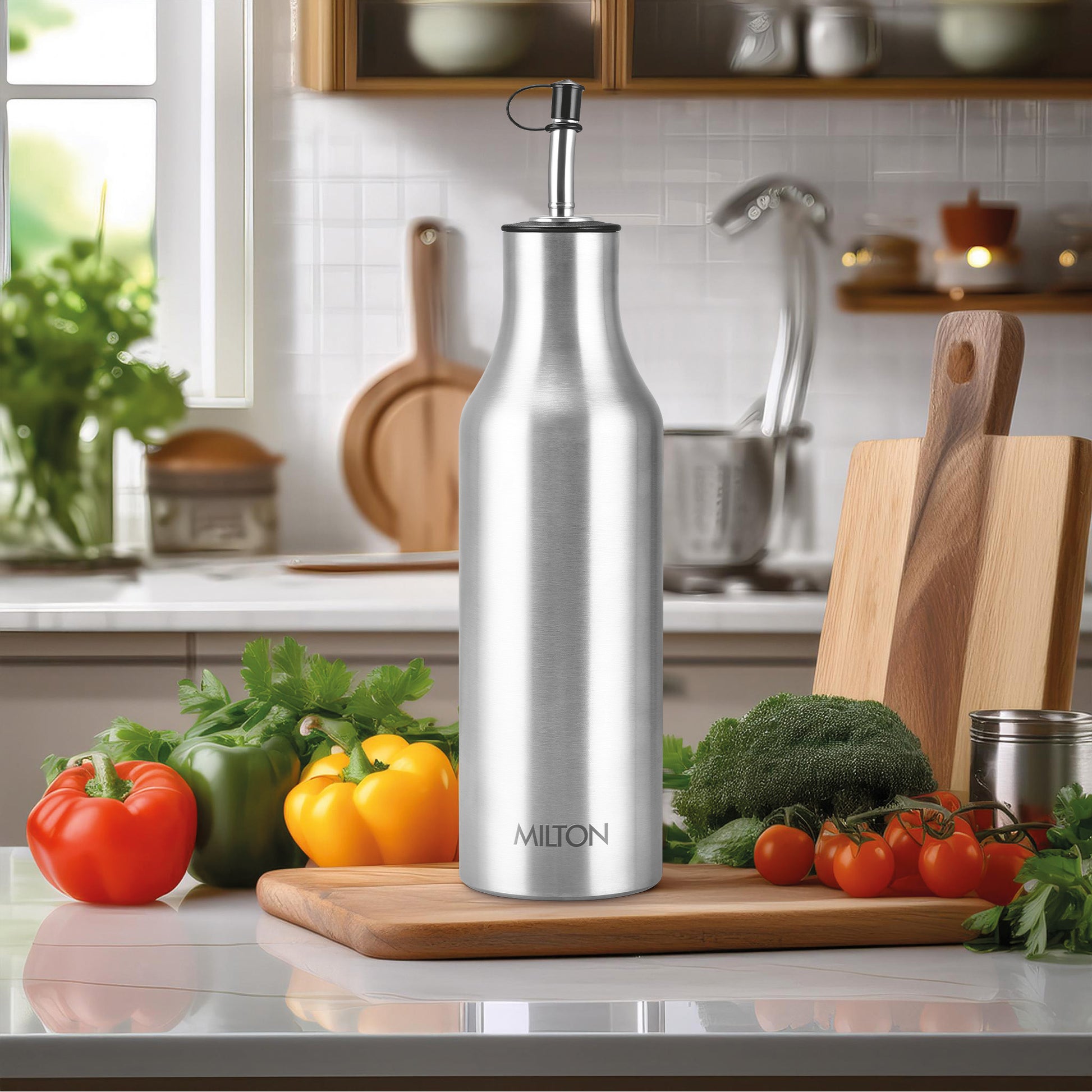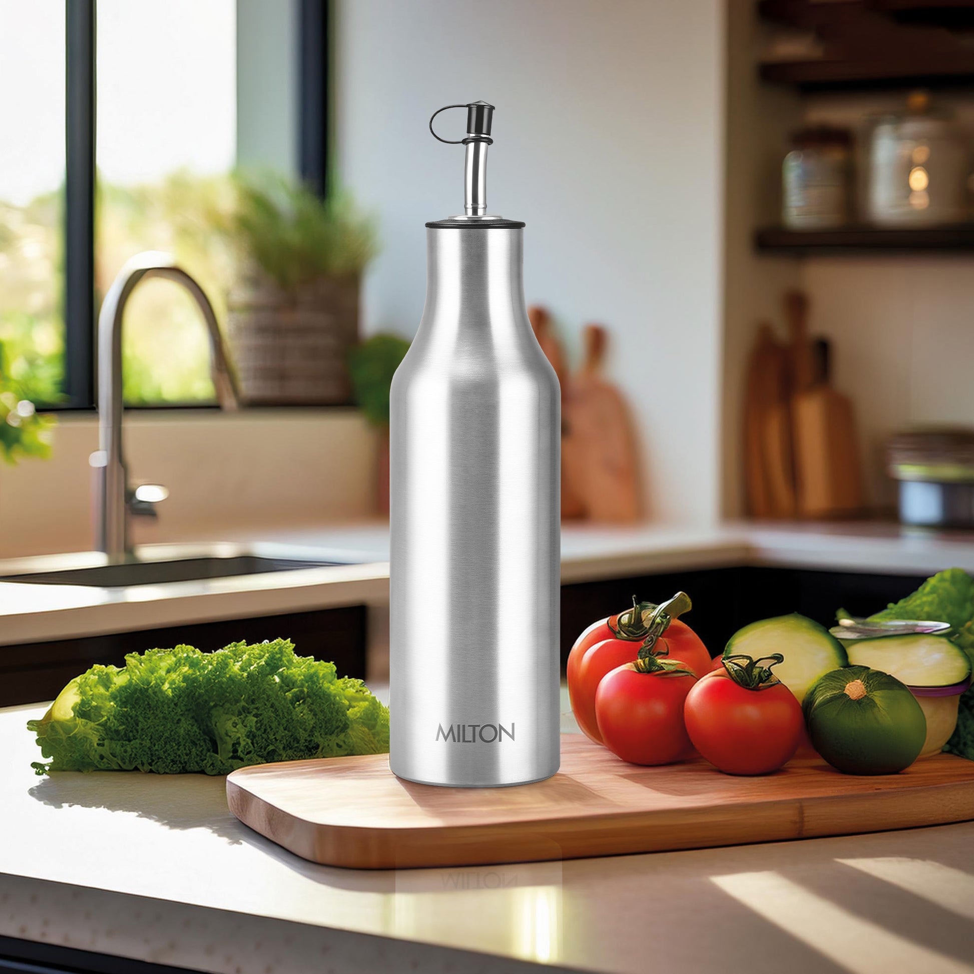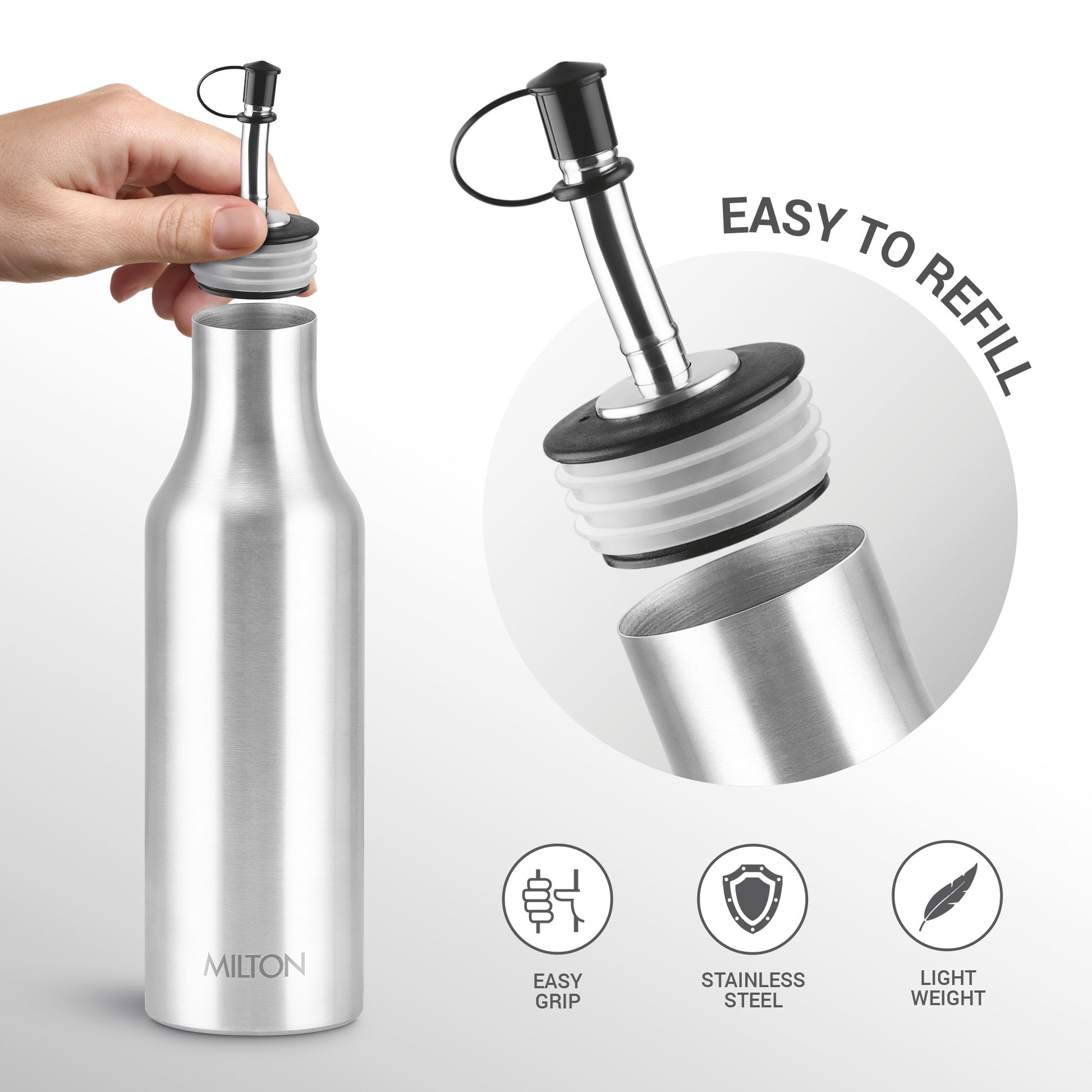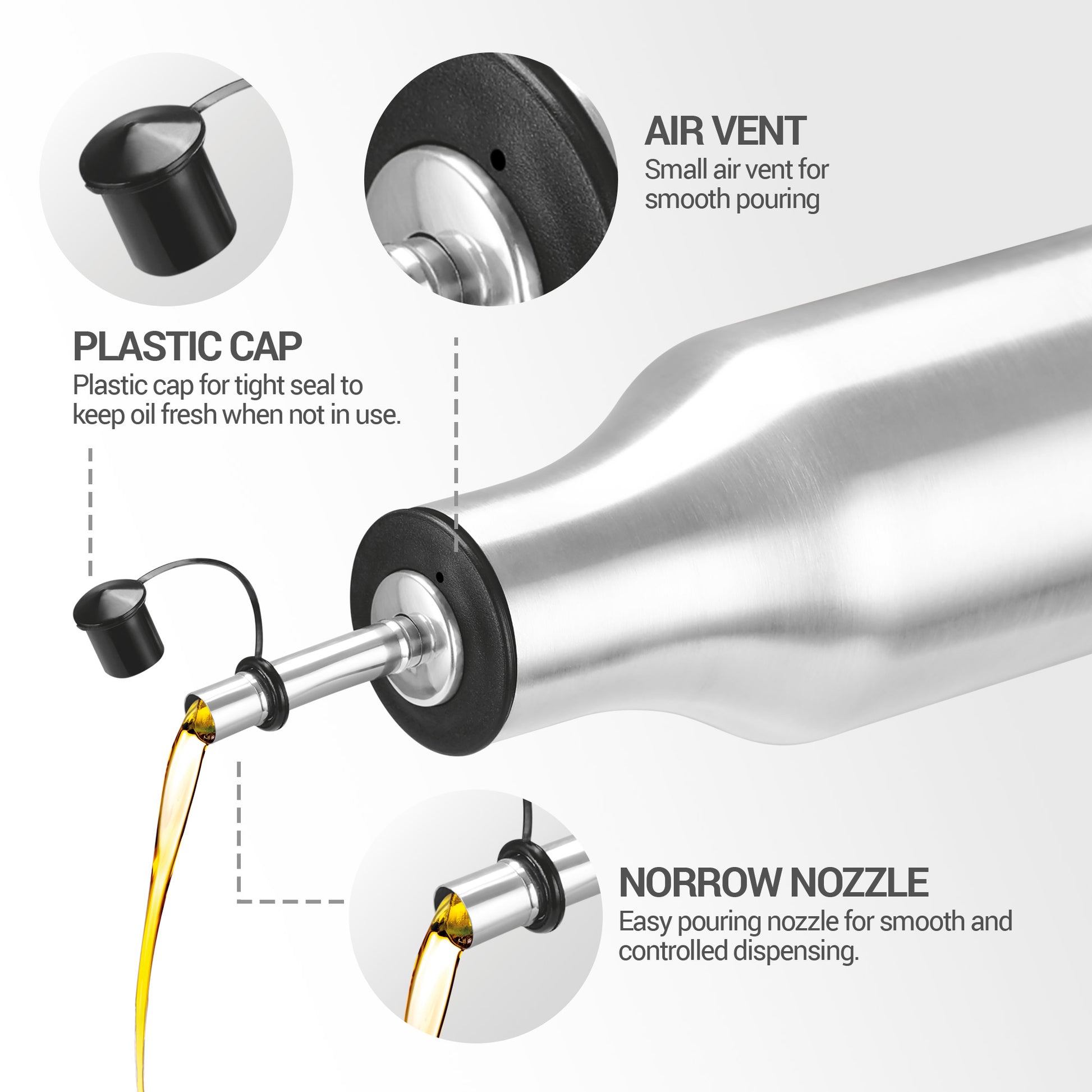 Made from high-quality, leak-proof, and odor-proof stainless steel. It keeps your oil fresh and is a sustainable choice for your kitchen. The narrow nozzle and small air vent allow for precise and controlled pouring, preventing messy spills and over-seasoning. The comfortable shape makes it easy to grip and use. The 750ml capacity is perfect for most commonly used 500ml oil pouches, with a snap-fit lid for easy refills.