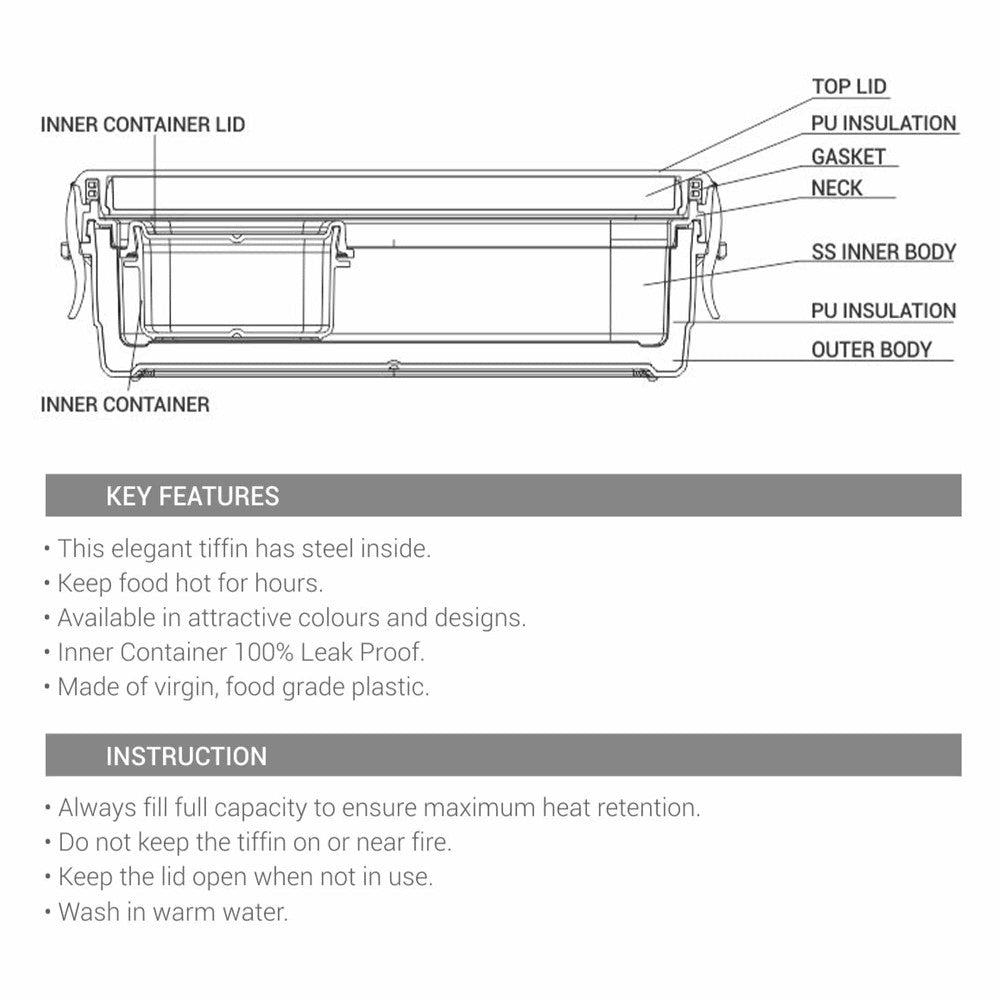 - The tiffin has a 1-year warranty and the lid with four side locking ensures it remains leakproof.