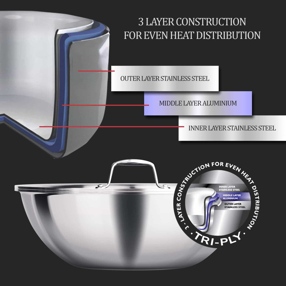 - Triply means 3 layers of metal bounded together : 1st layer - Food-grade 18/8 stainless steel on one side (for safe and healthy cooking), designed for longevity