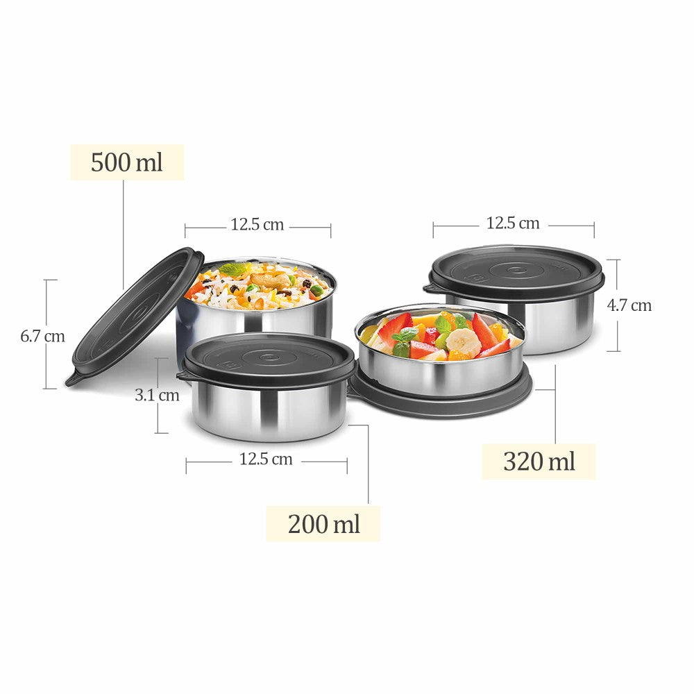 Colour: Black; Material: Stainless Steel; Package Content: 4 - Pieces Tasty Lunch Box (200ml, 320ml Each, 500ml); Dimension in cms(L x W x H) : 12.5 x 12.5 x 3.1.