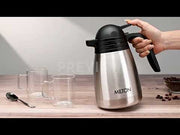 Insulated carafe made of high-quality stainless steel. Keeps beverages hot or cold for 24 hours. Convenient to use with a "Press & Pour" lid for one-handed pouring. Suitable for various occasions such as work functions, parties, and brunches. Comes with a 1-year warranty and can hold 1500 ml of liquid.