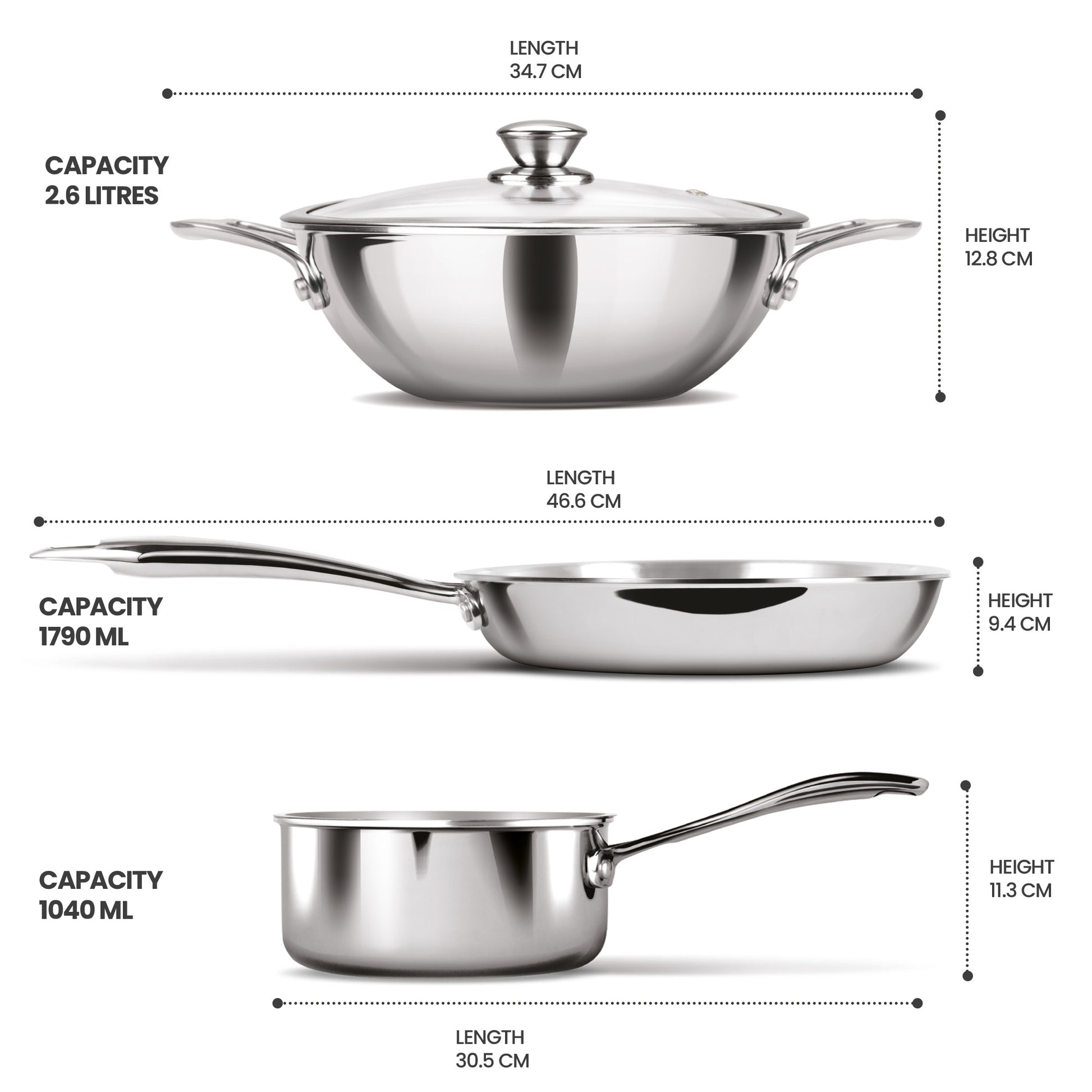 - Color: Silver; Material: Stainless Steel; Package Content: 3 Pcs set (Sauce Pan 14 cm, Fry Pan 24 cm, Kadhai 14 cm) ; Dimension in cms (L x W x H): 44.5 x 26.4 x 8.5