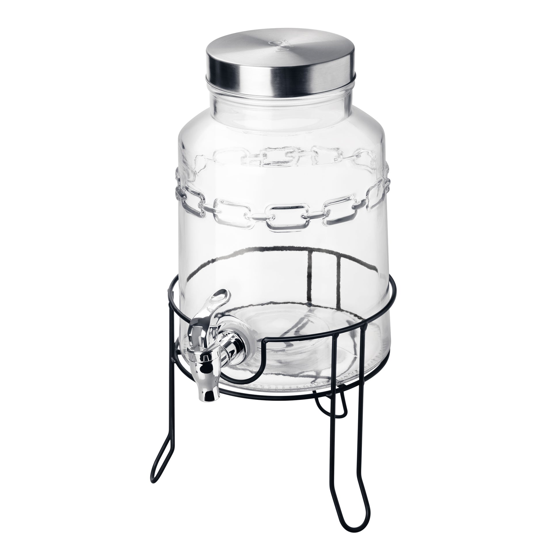 Raised on a sturdy black metal stand for effortless pouring.
