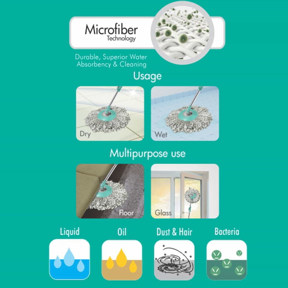 - The mop is multipurpose and can clean liquid, oil, dust, hair, and bacteria, making it a versatile cleaning tool.